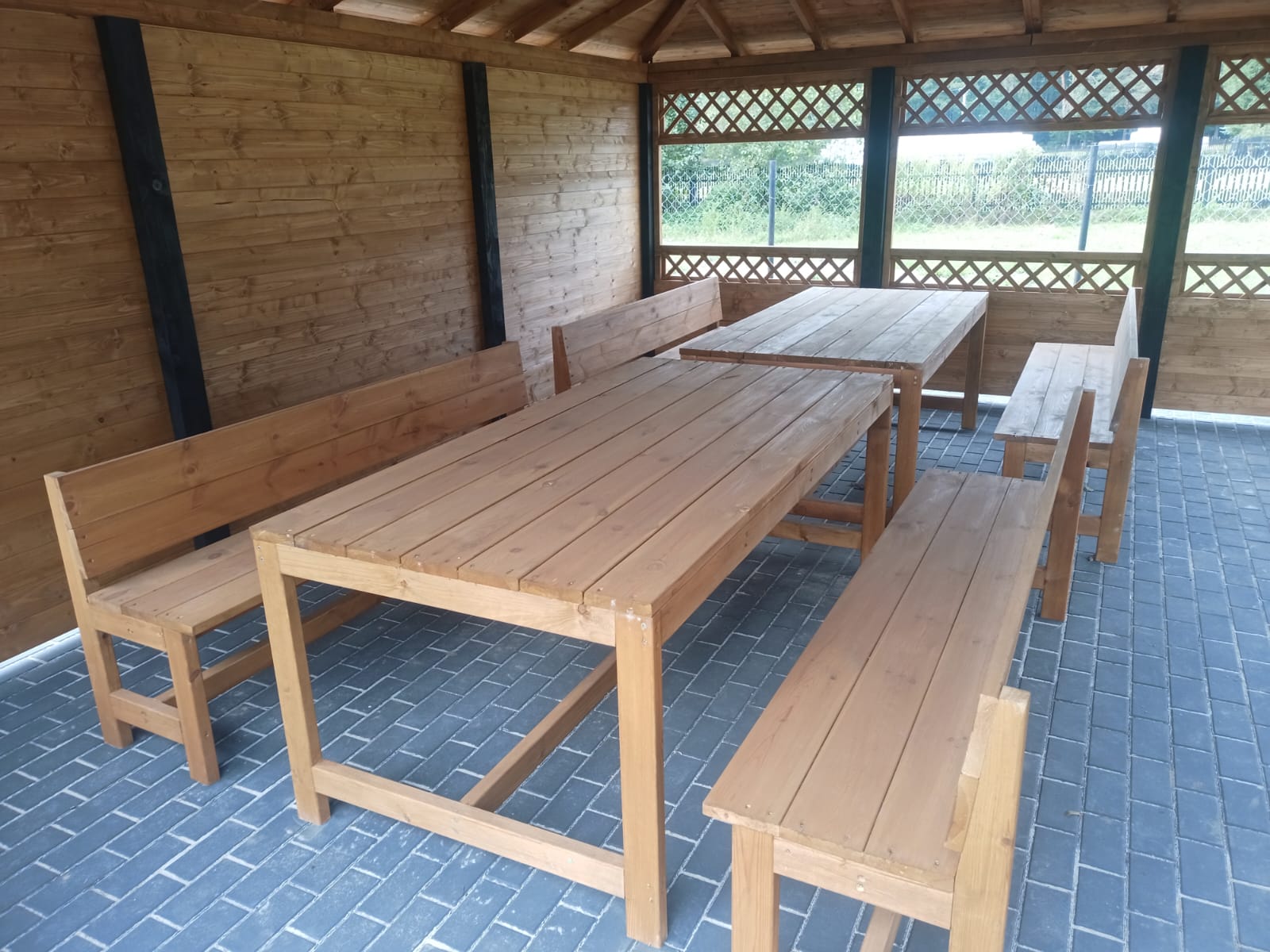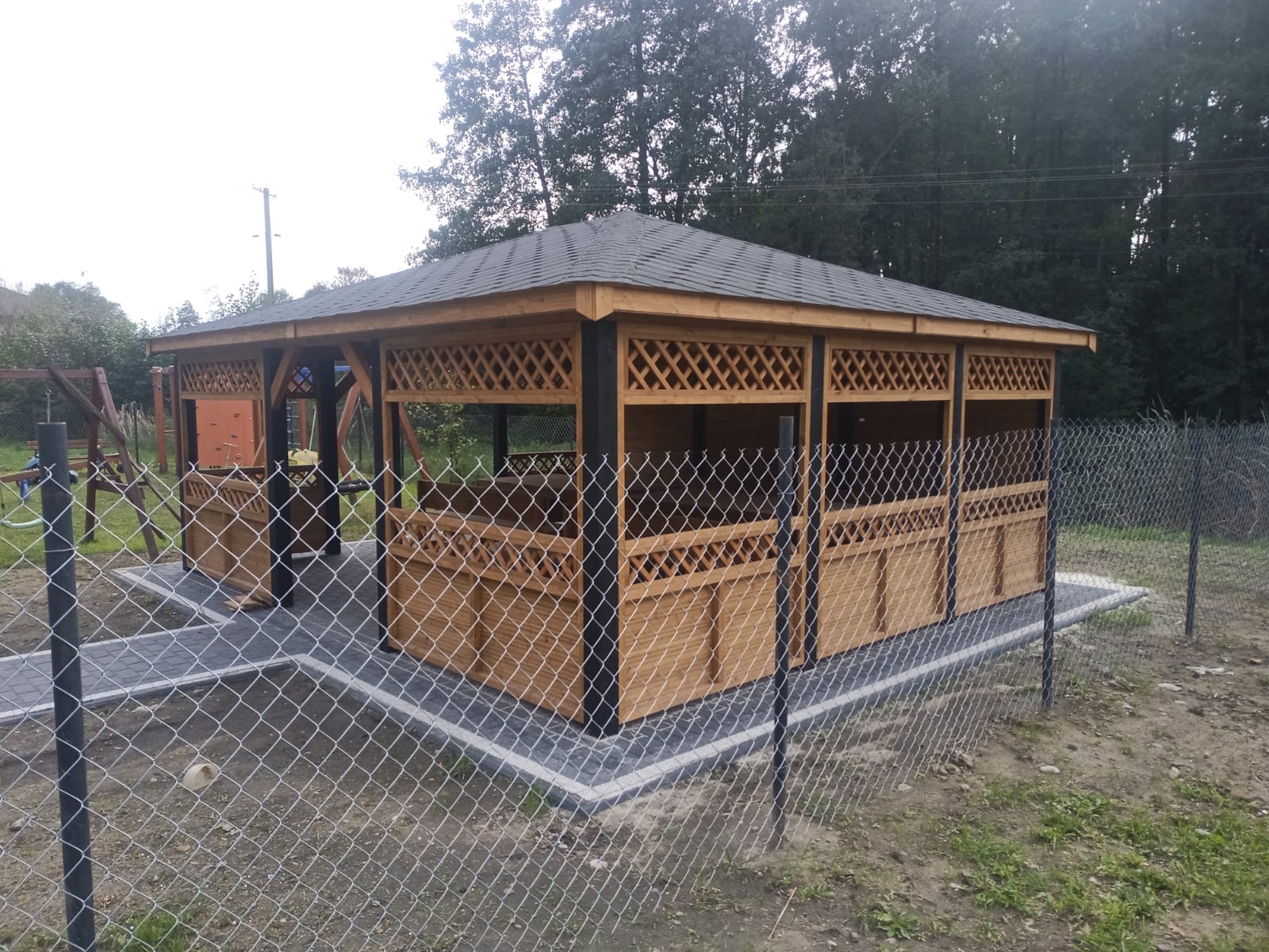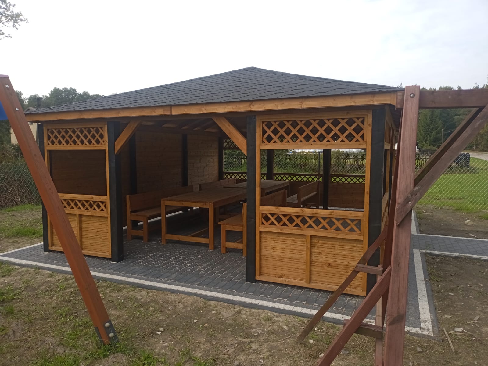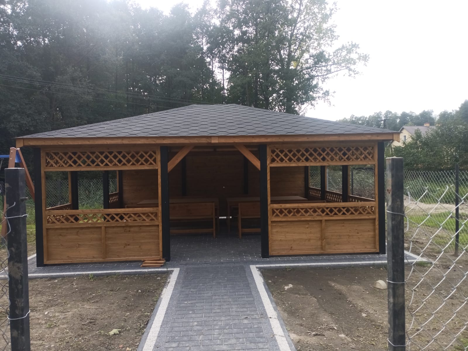 Drewniana altana z czarnym dachem stoi na brukowanym placu. Tło z drzewami i metalowym ogrodzeniem. Wewnątrz drewniane ławki.