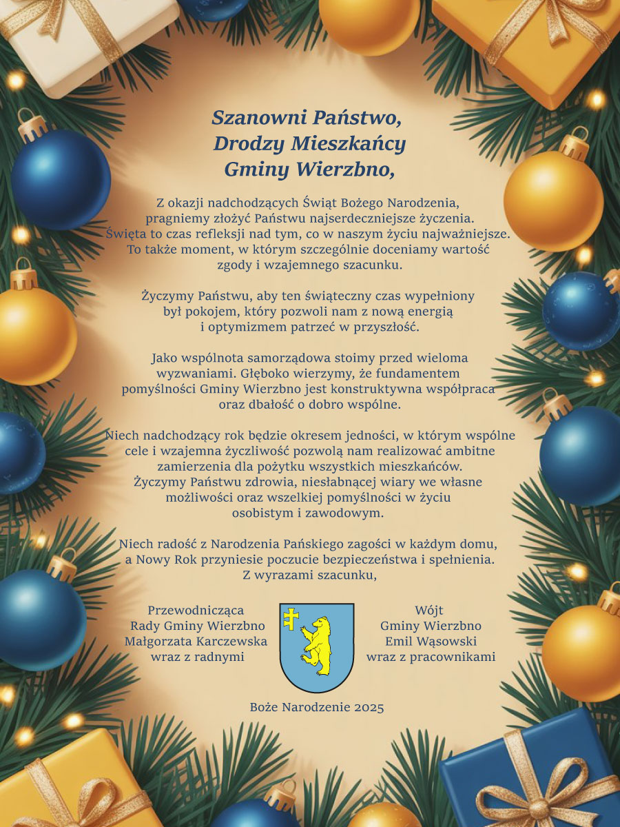 Jako wspólnota samorządowa stoimy przed wieloma wyzwaniami. Głęboko wierzymy, że fundamentem pomyślności Gminy Wierzbno jest konstruktywna współpraca oraz dbałość o dobro wspólne. Niech nadchodzący rok będzie okresem jedności, w którym wspólne cele i wzajemna życzliwość pozwolą nam realizować ambitne zamierzenia dla pożytku wszystkich mieszkańców.